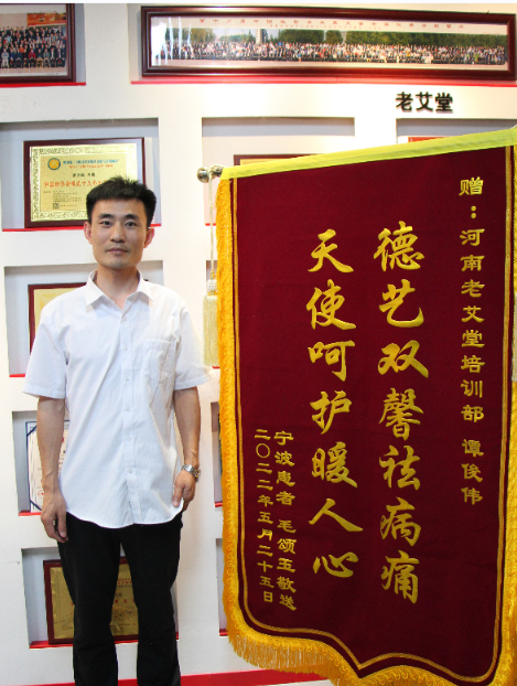 聽說譚老師是中醫(yī)出身,毛院長就試著讓譚老師為自己出出主意。譚老師為她辨證施治,開出了一個治療方法。毛院長回到寧波一邊經(jīng)營自己的艾灸館,一邊為自己做調(diào)理。沒想到很快就好了。毛院長開心的不得了,特別定制了一面大錦旗,郵寄給遠(yuǎn)在鄭州的譚老師。