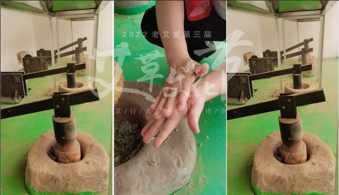 看完了翠綠的艾田,小分隊(duì)來到了艾草小屋工作坊,帶大家參觀先人流傳下來的原始的艾草制作工藝:石磨絨和石臼艾。